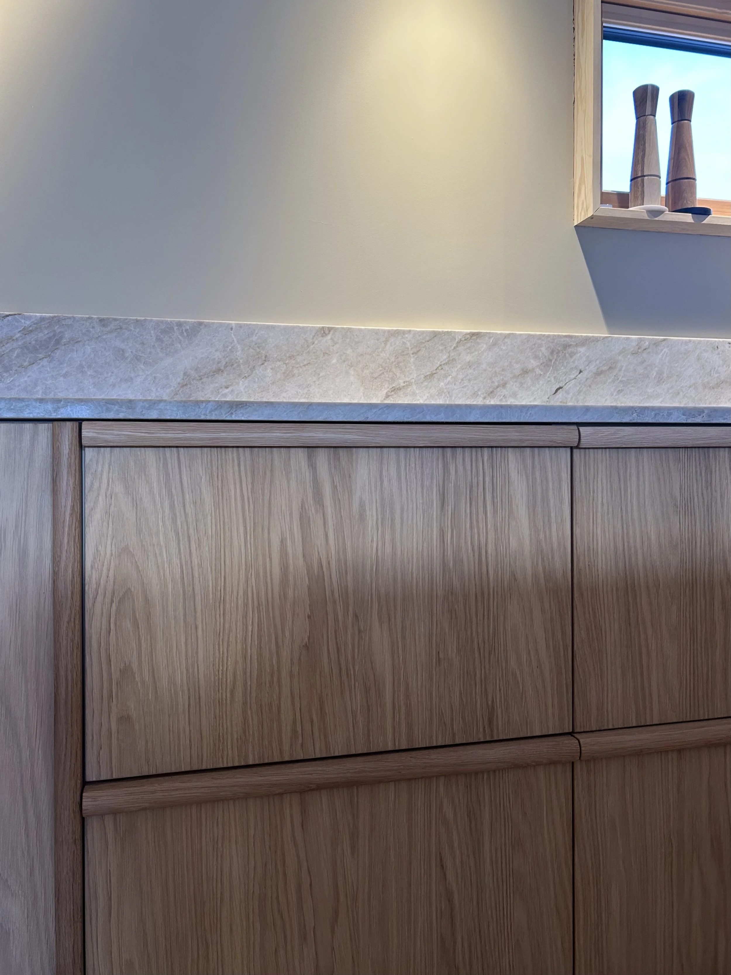 Skreddersydd kjøkken med fronter i eikefinér og naturstein